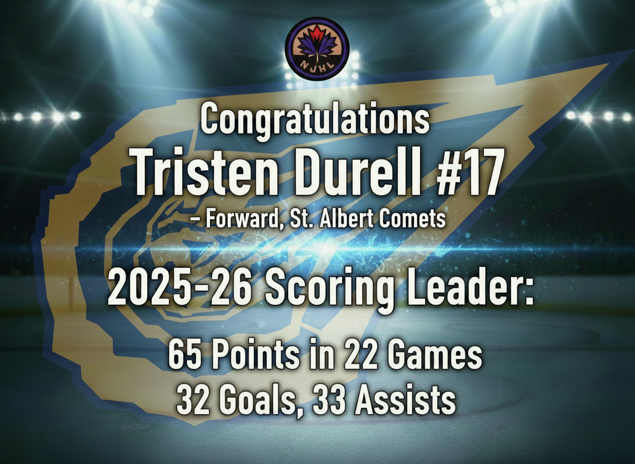 Congratulations to Tristen Durell of the St. Albert Comets 2025-26 NJHL Scoring leader
